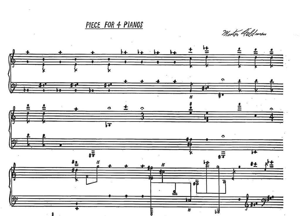 Dans la série des 4 Extensions, et en particulier dans Extensions IV, Morton Feldman revient au plus près du matériau dans un système de notation plus déterminé, même s’il jugera en définitive cette méthode « trop unidimensionnelle », ce qui fera dire à John Cage : « La musique conventionnellement notée par Feldman, c’est lui-même jouant sa musique graphique. »