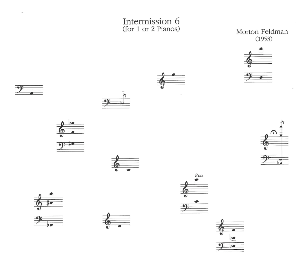 La série des 6 Intermissions, écrites entre 1950 et 1953, est en notation traditionnelle. La partition apparaît sous une forme « mobile » : 15 accords ou sons isolés sont dispersés dans l’espace d’une page que l’interprète parcourt à son gré. Il est noté par le compositeur : « La pièce commence avec n’importe quel son, puis continue avec n’importe quel autre. Chaque son doit être produit avec un minimum d’attaque, de manière à être à peine audible. Les sons notés ne doivent pas être joués trop rapidement. » Dans une version à 2 pianos, les 2 pianistes jouent indépendamment l’un de l’autre.