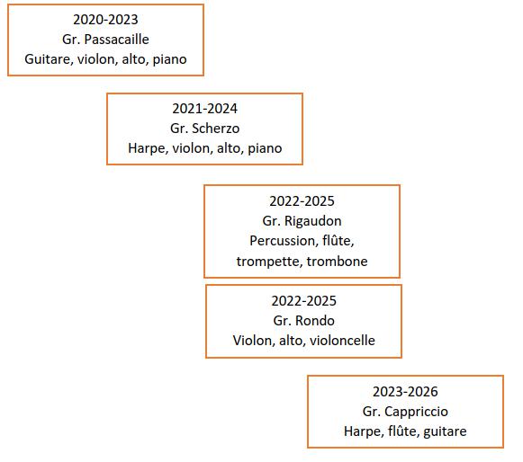 La première promotion, Passacaille, vient de terminer le cycle de 3 ans, entre temps d’autres Gruppetti ont été mis en place, en respectant toujours le principe de volontariat des enseignants et en essayant de tendre vers une instrumentation plus cohérente (vents/percussion, cordes etc.) :