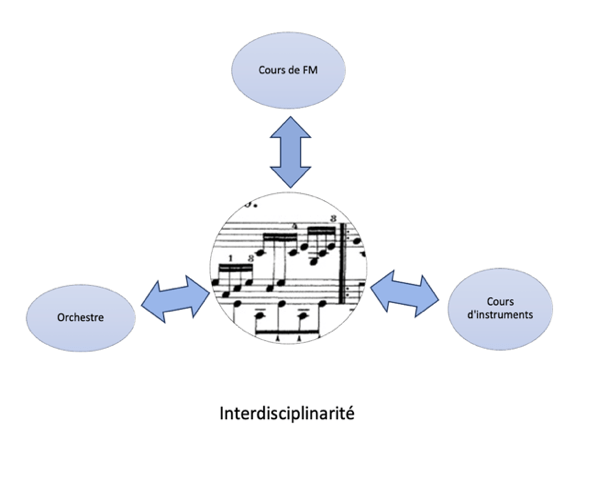 L’interdisciplinarité implique une interaction, un entrelacement entre plusieurs disciplines, par une mise en relation didactique et pédagogique de notions et de contenus. Par exemple, une partition, étudiée simultanément en cours d’instrument, de formation musicale et d’orchestre constitue une pratique pédagogique interdisciplinaire.