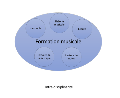 L’intradisciplinarité désigne les relations qui se tissent entre les objets d’une même discipline. Par exemple, des liens intradisciplinaires sont établis entre harmonie, théorie, écoute, histoire de la musique, lecture, chant etc. qui constituent les cours de formation musicale.