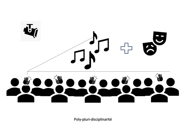 La pluridisciplinarité implique plusieurs disciplines dans un objectif, un projet commun. Par exemple, une production d’élèves réunissant musiciens et comédiens sur scène, qui vont additionner leurs talents au service d’un spectacle.